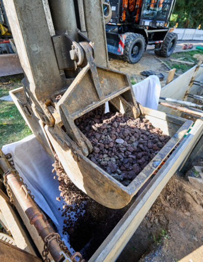 - Wasserspeicherung: Rockflow Steinwolle wird in die Hauptverfüllung des Leitungsgrabens eingebaut. Rockflow speichert große Regenwassermengen und gibt Wasser kapillar an die neu gepflanzten Bäume ab.