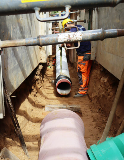 - Rohrsystem: Duktile Gussrohre mit Zementmörtelumhüllung. Diese Rohre sind wurzelfest und sichern die Abwasserableitung trotz Nutzung der Leitungszone als Wurzelraum.